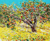 이 작품은 다채로운 색감과 강렬한 붓 터치로 가득한 과수원의 풍경을 담고 있습니다. 그림의 중심에는 탐스러운 과일이 매달린 나무가 자리 잡고 있으며, 나무 주변의 초록색 잎과 노란 들판, 그리고 파란 하늘이 조화롭게 어우러져 생동감 넘치는 자연의 에너지를 표현합니다. 작가는 두꺼운 물감과 질감을 활용해 과일의 풍성함과 자연의 활기를 강조했으며, 화려한 색채와 역동적인 붓 터치를 통해 화면에 생동감을 더했습니다.
