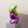 작가는 삶의 여정을 무중력의 행복감이 느껴지도록 푹신한 쿠션, 풍만한 하트, 소파 등 인생의 무게를 완충하는 사물을 통해 표현합니다. 작품을 이룬 금속재질은 심상의 필터로 보면 부유하는 버블처럼 작품에 손을 대면 두둥실 떠오를 것 같아 꿈결을 유영하는 힐링을, 어부바 하듯 서로를 지탱하는 형상은 심리적 위안을 줍니다. 쿠션중앙에 생긴 주름으로 인해 쿠션에서 입술, 꽃잎, 포춘 쿠키 등 다양한 연상으로 뻗어갑니다.