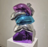 작가는 삶의 여정을 무중력의 행복감이 느껴지도록 푹신한 쿠션, 풍만한 하트, 소파 등 인생의 무게를 완충하는 사물을 통해 표현합니다. 작품을 이룬 금속재질은 심상의 필터로 보면 부유하는 버블처럼 작품에 손을 대면 두둥실 떠오를 것 같아 꿈결을 유영하는 힐링을, 어부바 하듯 서로를 지탱하는 형상은 심리적 위안을 줍니다. 쿠션중앙에 생긴 주름으로 인해 쿠션에서 입술, 꽃잎, 포춘 쿠키 등 다양한 연상으로 뻗어갑니다.